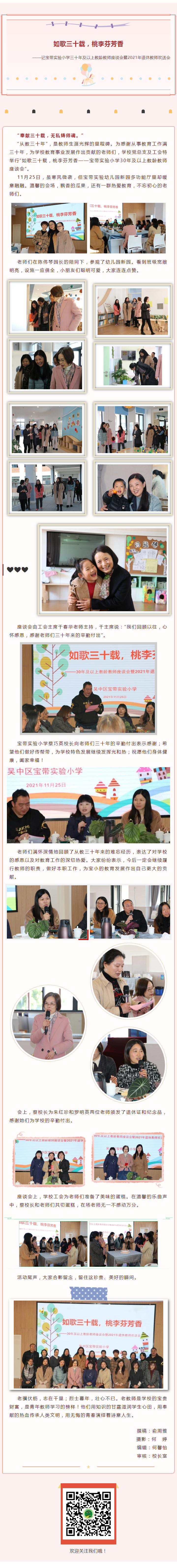【凌霄新闻台】如歌三十载,桃李芬芳香 ——记宝带实验小学三十年及以上教龄教师座谈会暨2021年退休教师欢送会 来源: 发布时间:2021-11-30 16:00:37 浏览次数: 次 【字体:小 大】 分享到: 【打印正文】