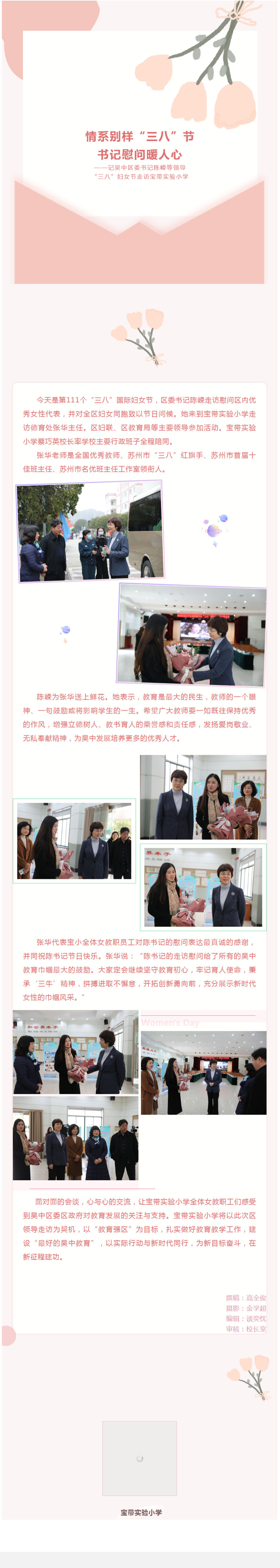 情系别样“三八”节 书记慰问暖人心 ——记吴中区委书记陈嵘等领导“三八”妇女节走访宝带实验小学 来源: 发布时间:2021-03-09 08:34:09 浏览次数: 次 【字体:小 大】 分享到: 【打印正文】