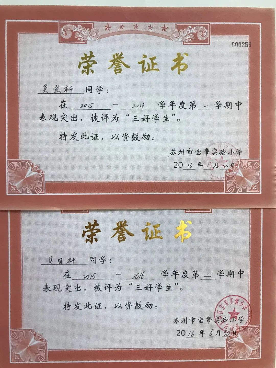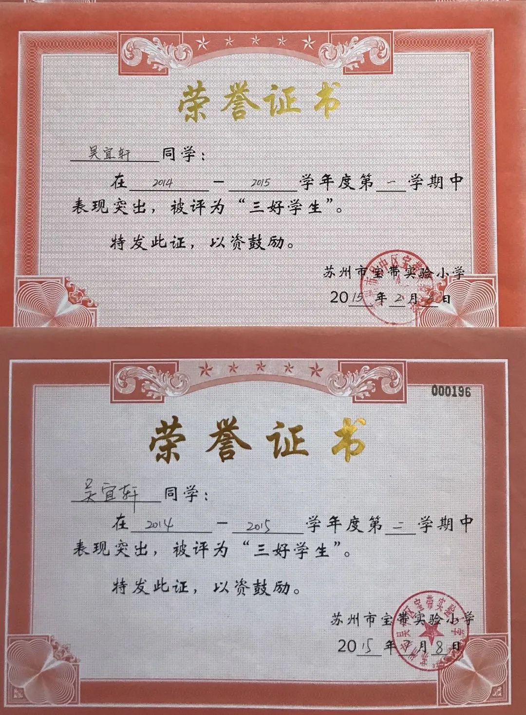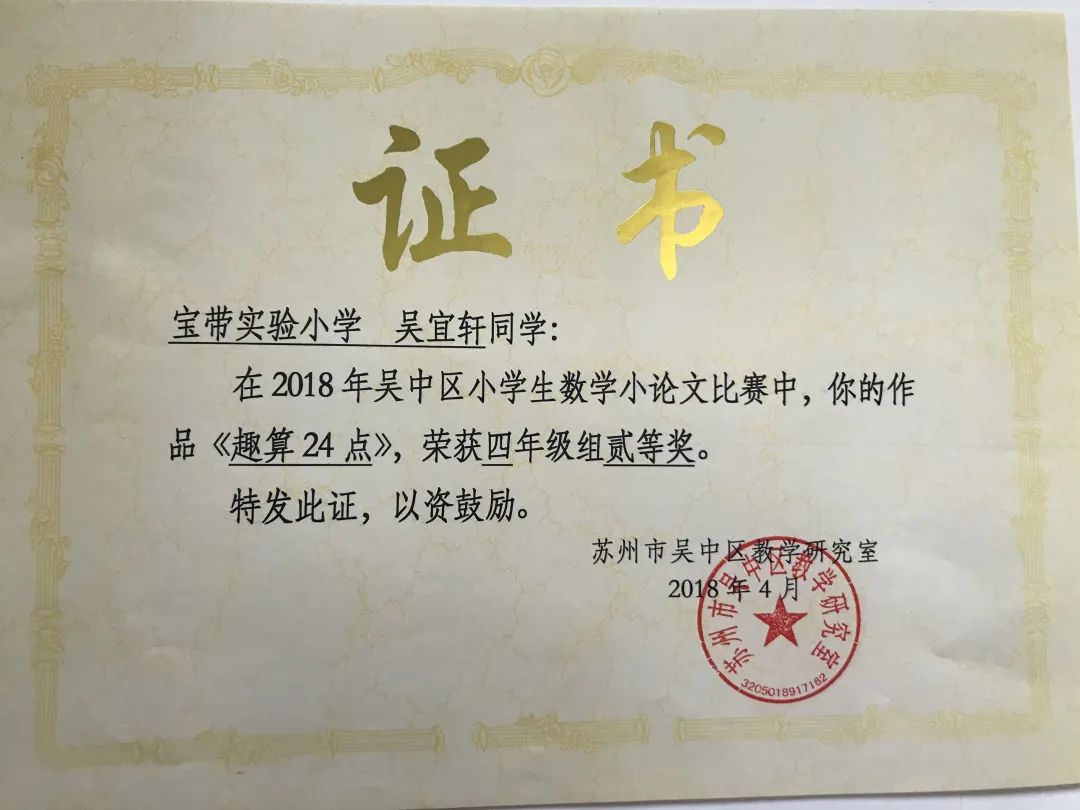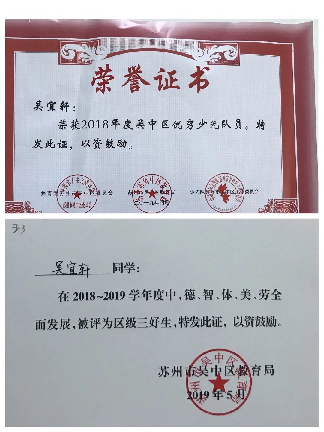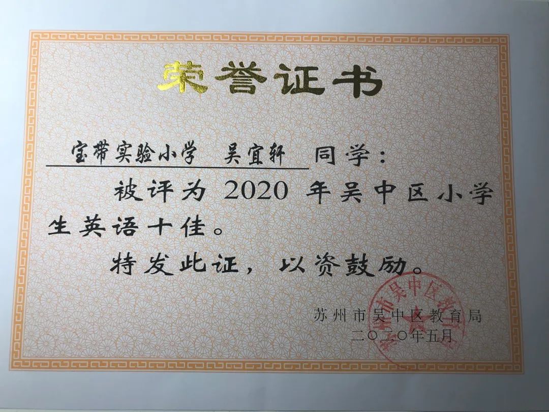 一至六年级,她每学期都被评为“三好学生”,还先后获得“吴中区优秀少先队员”“吴中区三好学生”“吴中区英语学科十佳”等荣誉。
