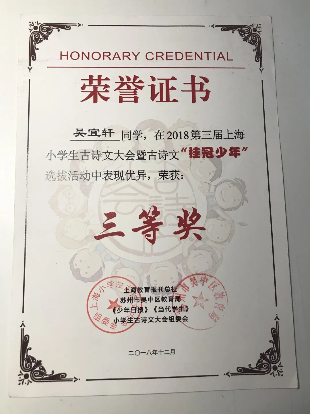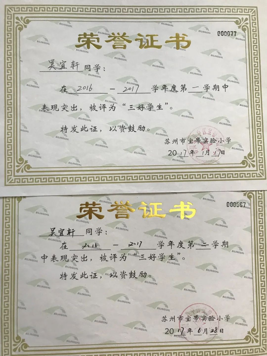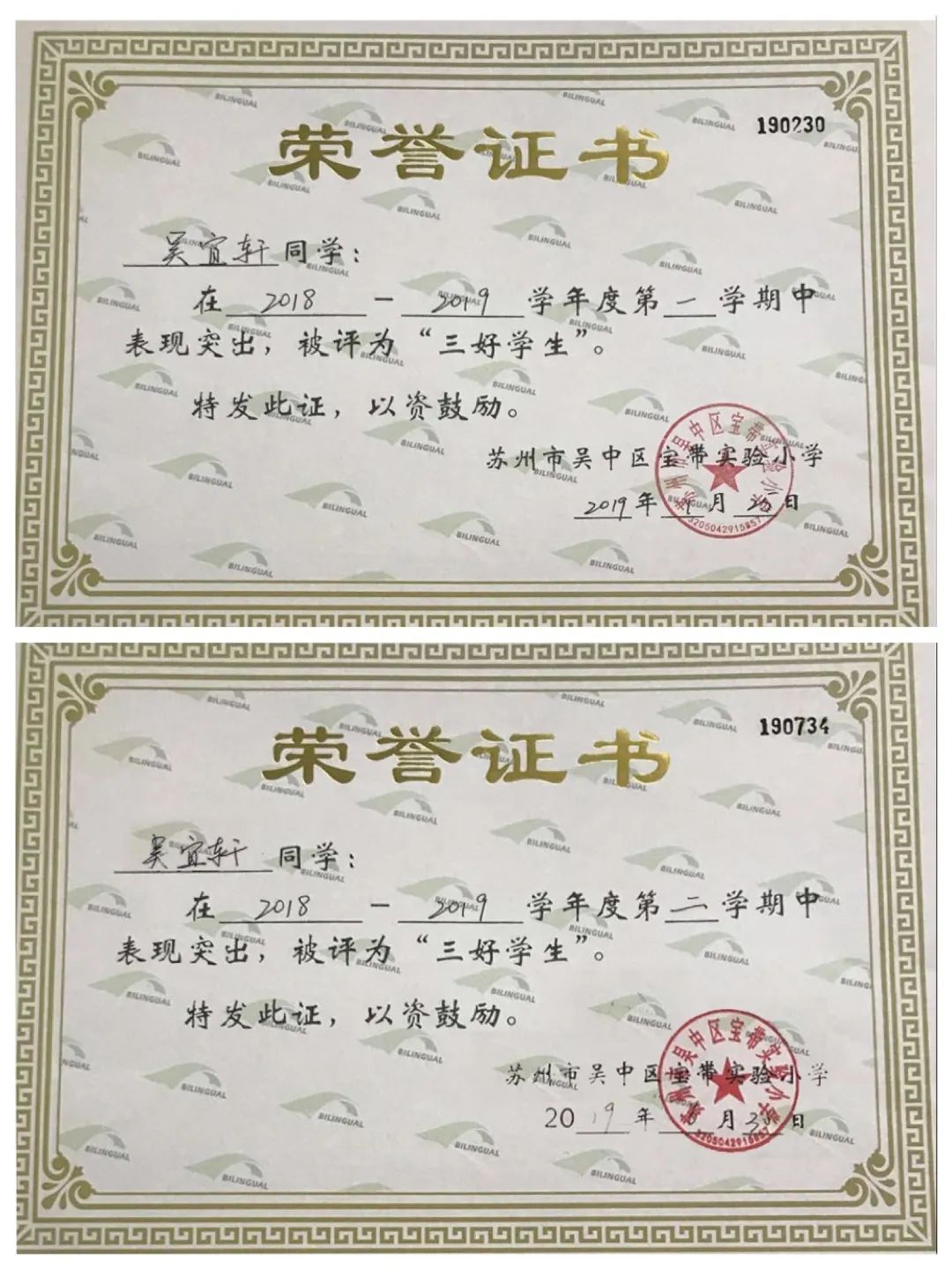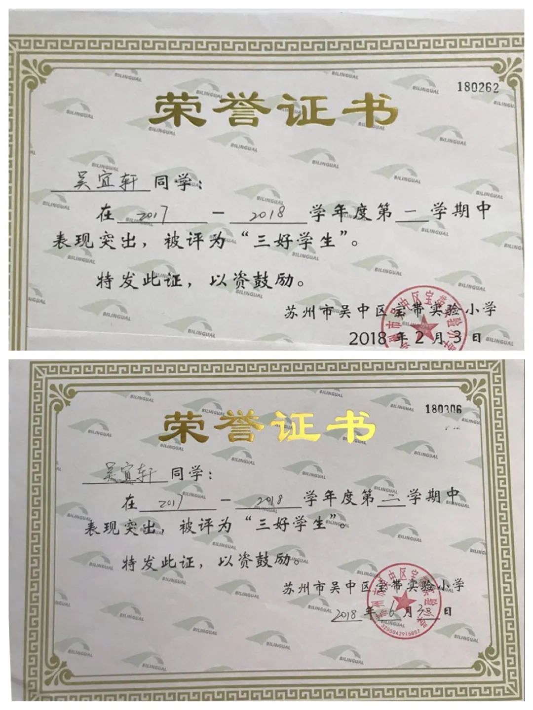 一至六年级,她每学期都被评为“三好学生”,还先后获得“吴中区优秀少先队员”“吴中区三好学生”“吴中区英语学科十佳”等荣誉。