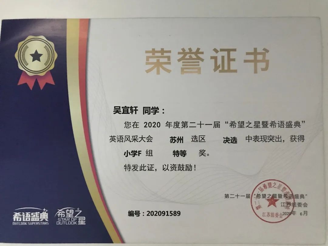 2020年在第二十一届“希望之星暨希语盛典”英语风采大会中获苏州赛区决赛小学特等奖