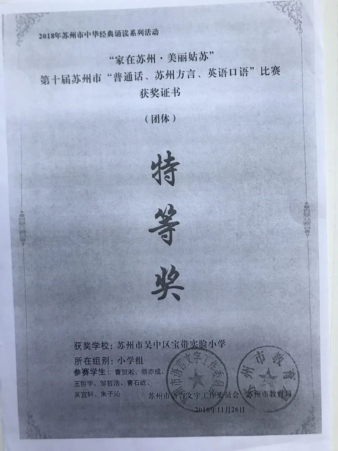 2018年在“第十届苏州市‘普通话、苏州方言、英语口语’比赛”中获特等奖。