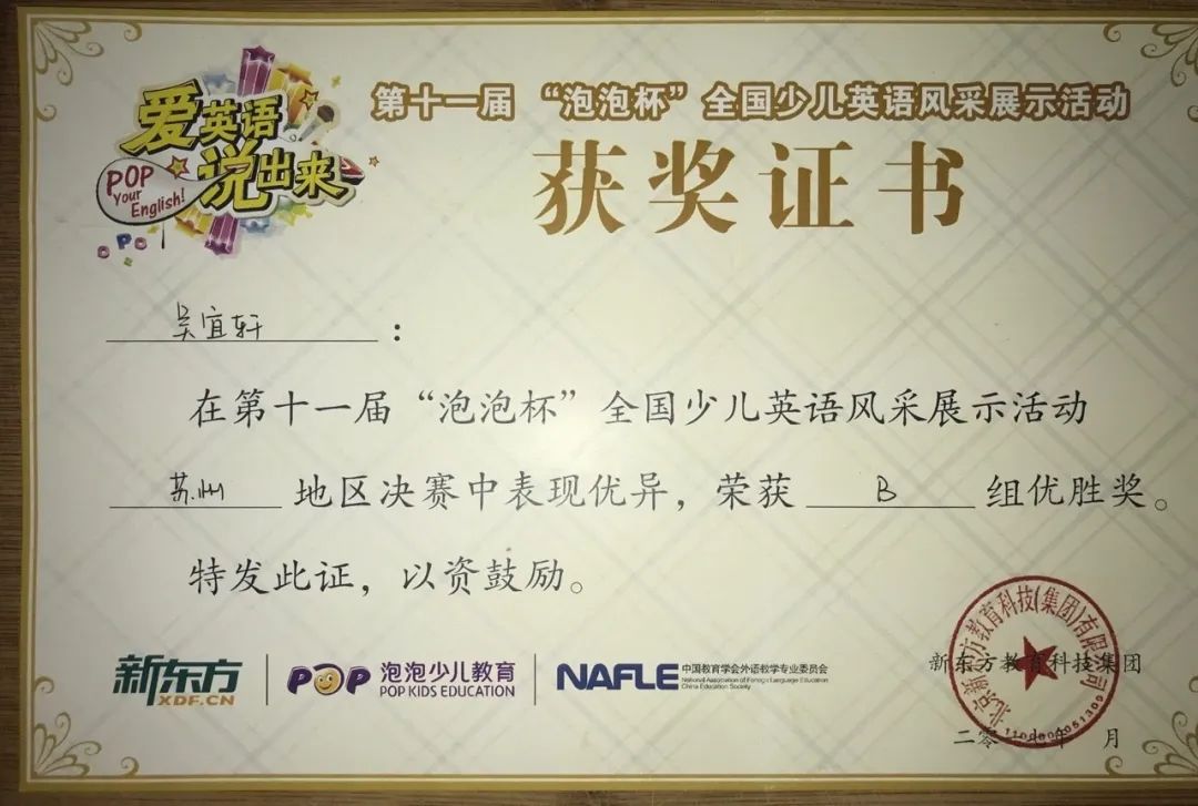 2017年在第十一届“泡泡杯”全国少儿英语风采展示活动苏州地区决赛中荣获B组优胜奖。
