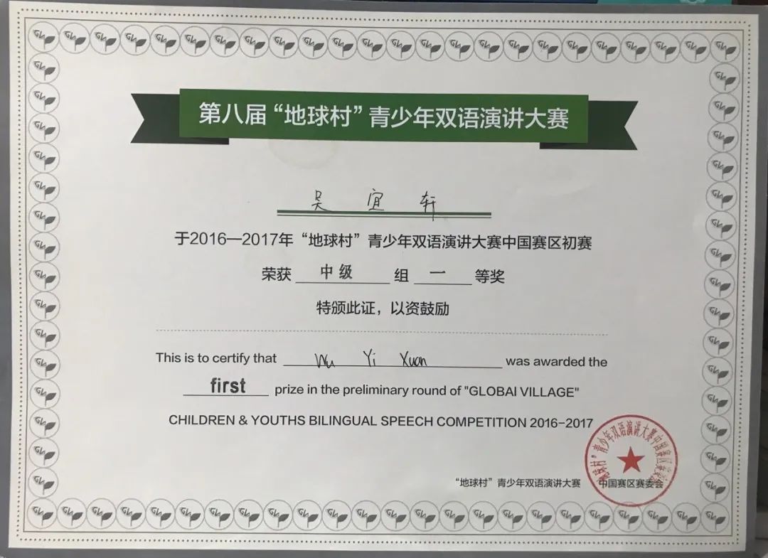 2016年-2019年间多次获“地球村”国际青少年双语演讲大赛中国赛区(英语)初赛一等奖。