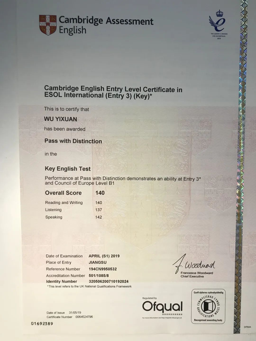 2019年以优异成绩通过剑桥少儿英语KET考试。