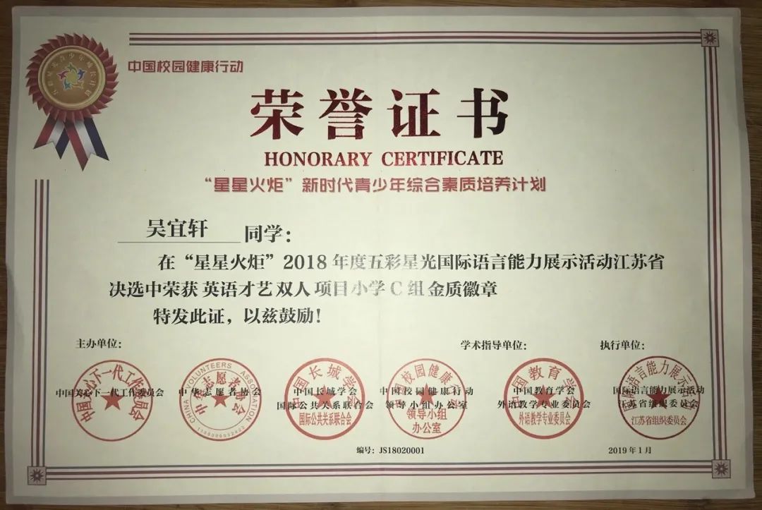 2018年在“星星火炬”江苏省决选中获小学组金质徽章。