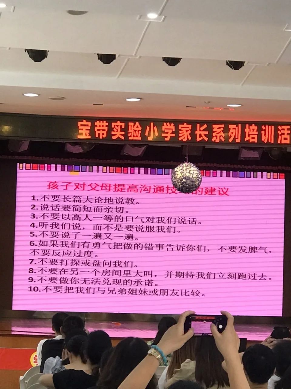 施老师送给了家长十条“孩子对父母提高沟通技巧的建议”,以此结束了本次培训活动。沈校长作了总结发言,爱孩子,需要方法,更需要智慧,让孩子在家长和善并坚定的陪伴中主动成长,健康发展!
