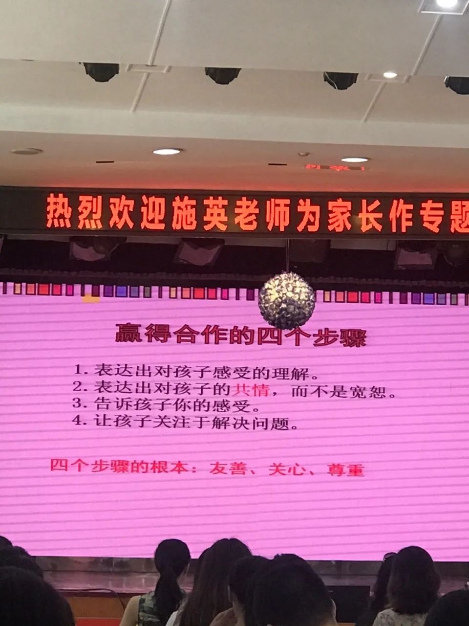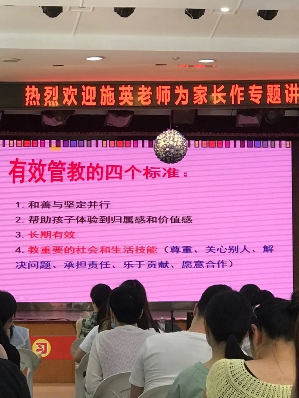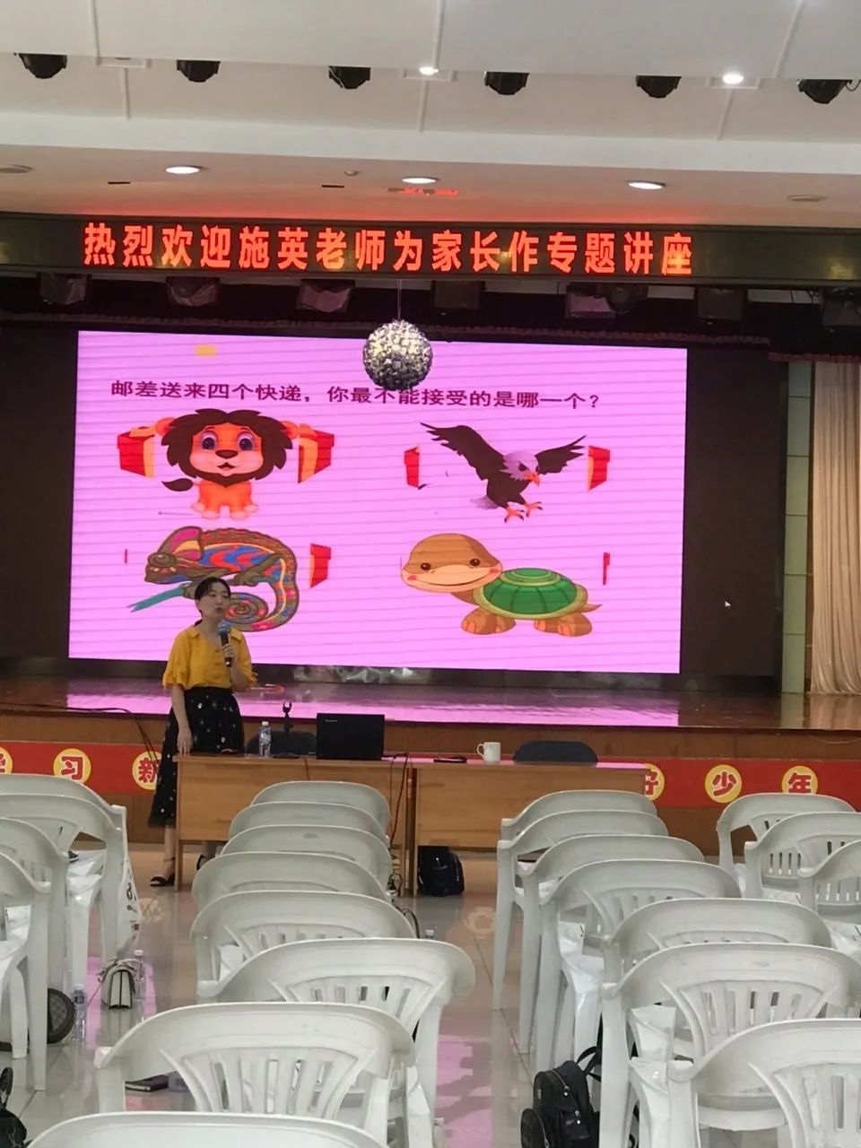 临近学期结束,我校开展了家长系列培训活动。这次活动特邀教育心理学博士生、国家二级心理咨询师、高级家庭教育指导师、正面管教讲师、苏州市心理名师施英老师为大作《做和善并坚定的陪伴者》的专题讲座。