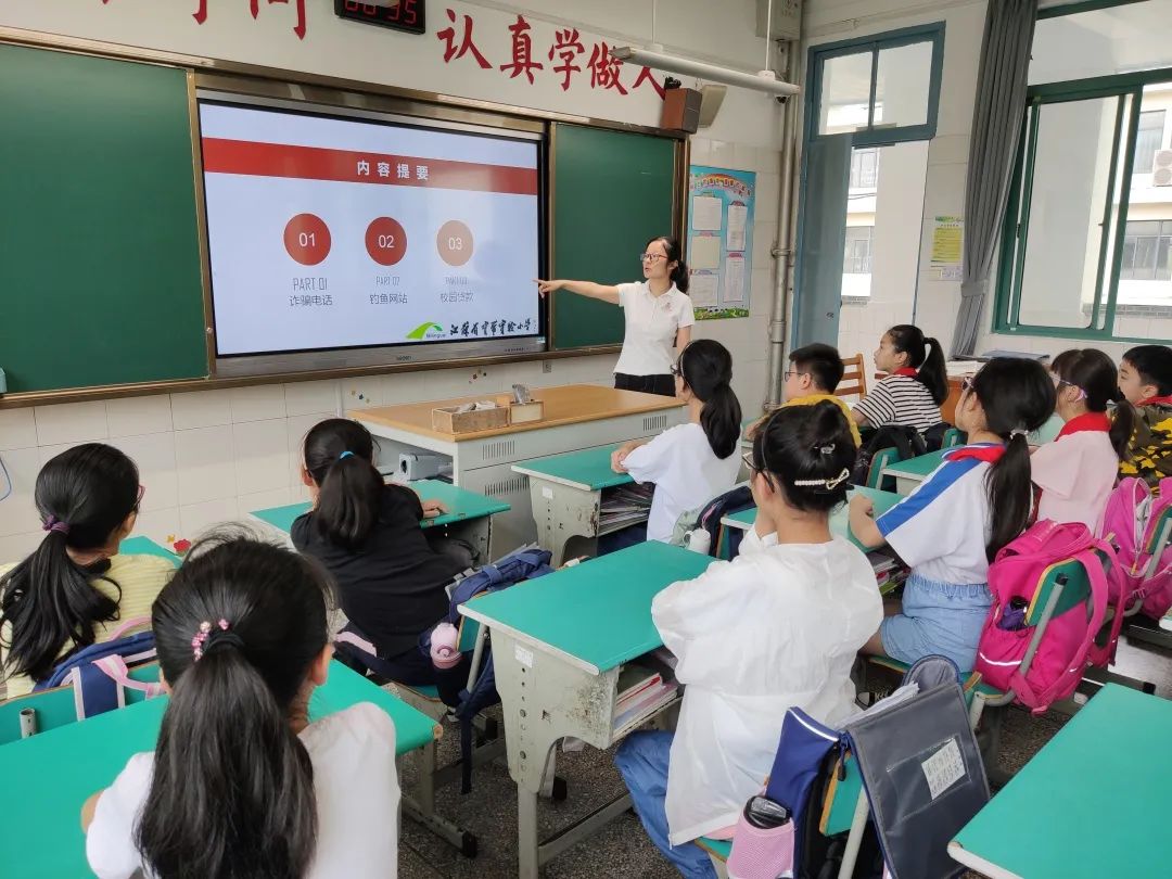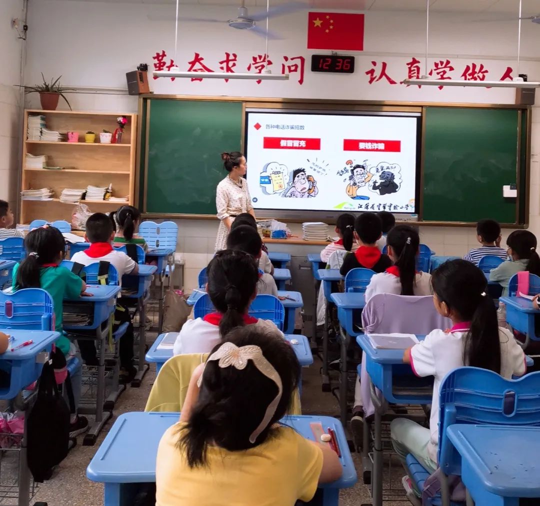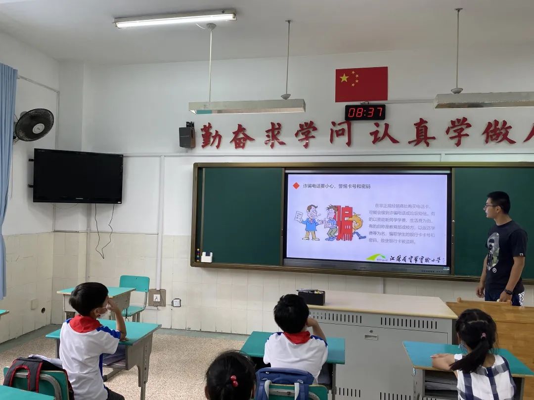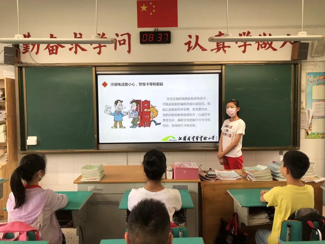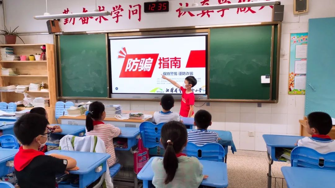 在周一集体晨会时,学校少先队通过校园电视台开展了《保持警惕 谨防诈骗》的主题教育活动。