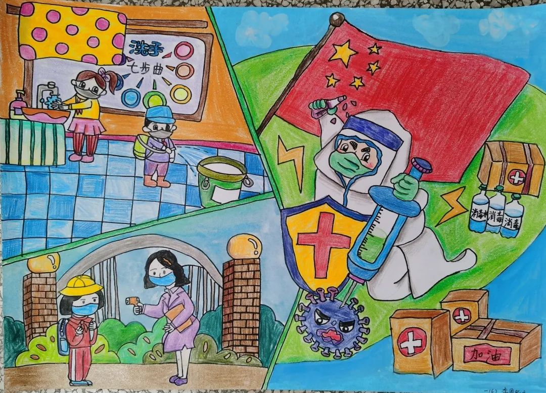 大家好,我叫李周昕奕,来自一(2)班。我从四岁就开始学习画画了,现在是儿童画叁级。这次比赛,我画的作品名字叫做《防疫,战疫》,由三部分组成,相信在我们国家的科学家和医生共同努力下,一定会战胜病毒。