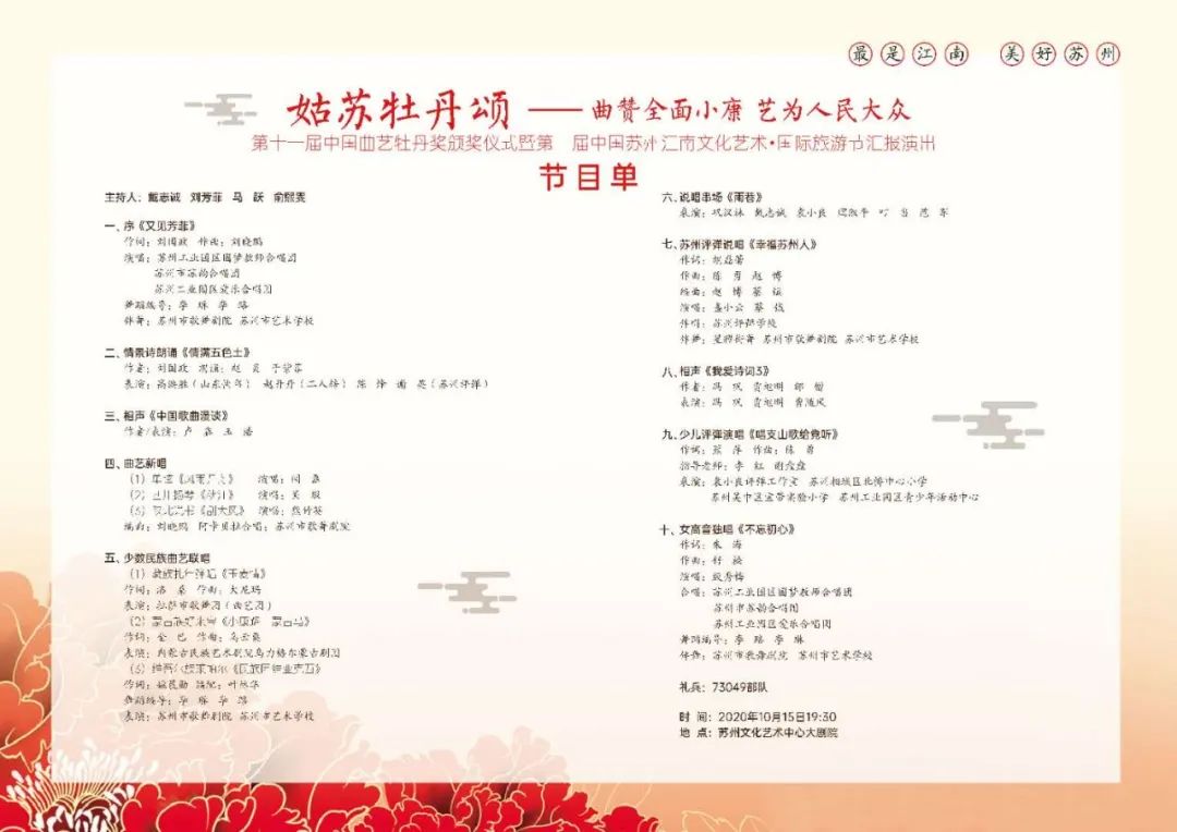 10月15日晚上,姑苏牡丹颂——“曲赞全面小康 艺为人民大众”第十一届中国曲艺牡丹奖颁奖仪式暨第二届中国苏州江南文化艺术·国际旅游节汇报演出在苏州文化艺术中心隆重举行。