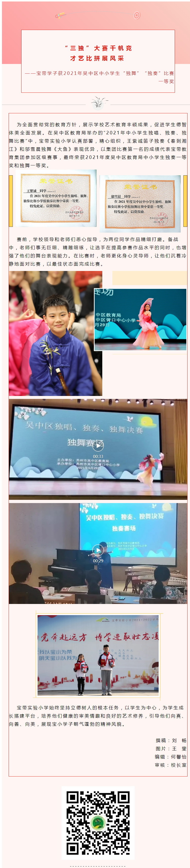 【凌霄新闻台】“三独”大赛千帆竞 才艺比拼展风采 ——宝带学子获2021年吴中区中小学生“独舞”“独奏”比赛一等奖 来源: 发布时间:2021-11-03 11:04:14 浏览次数: 次 【字体:小 大】 分享到: 【打印正文】