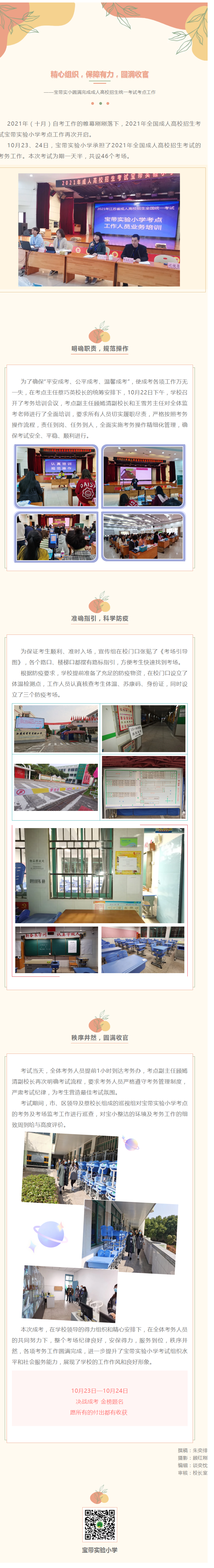 【凌霄新闻台】精心组织,保障有力,圆满收官 ——宝带实小圆满完成成人高校招生统一考试考点工作 来源: 发布时间:2021-10-25 09:30:29 浏览次数: 次 【字体:小 大】 分享到: 【打印正文】