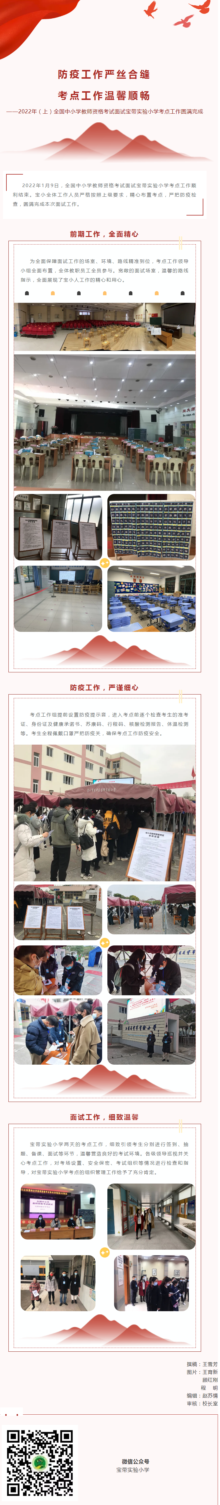 【凌霄新闻台】防疫工作严丝合缝,考点工作温馨顺畅 ——2022年(上)全国中小学教师资格考试面试宝带实验小学考点工作圆满完成 来源: 发布时间:2022-01-11 14:41:32 浏览次数: 次 【字体:小 大】 分享到: 【打印正文】