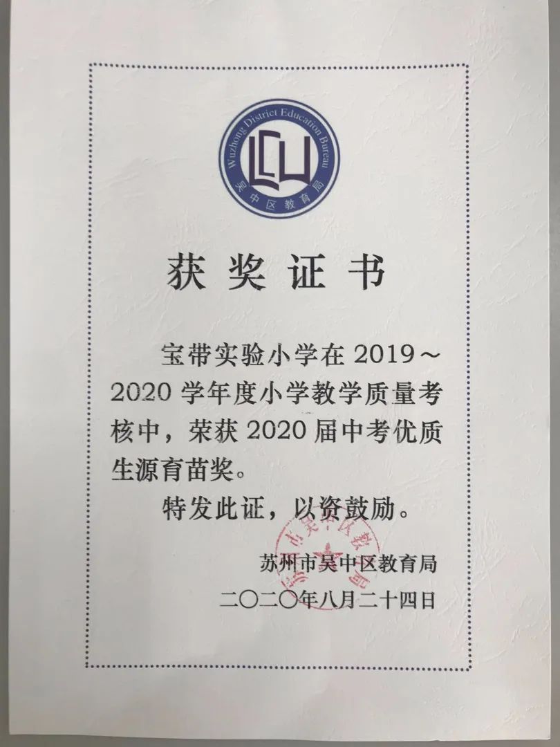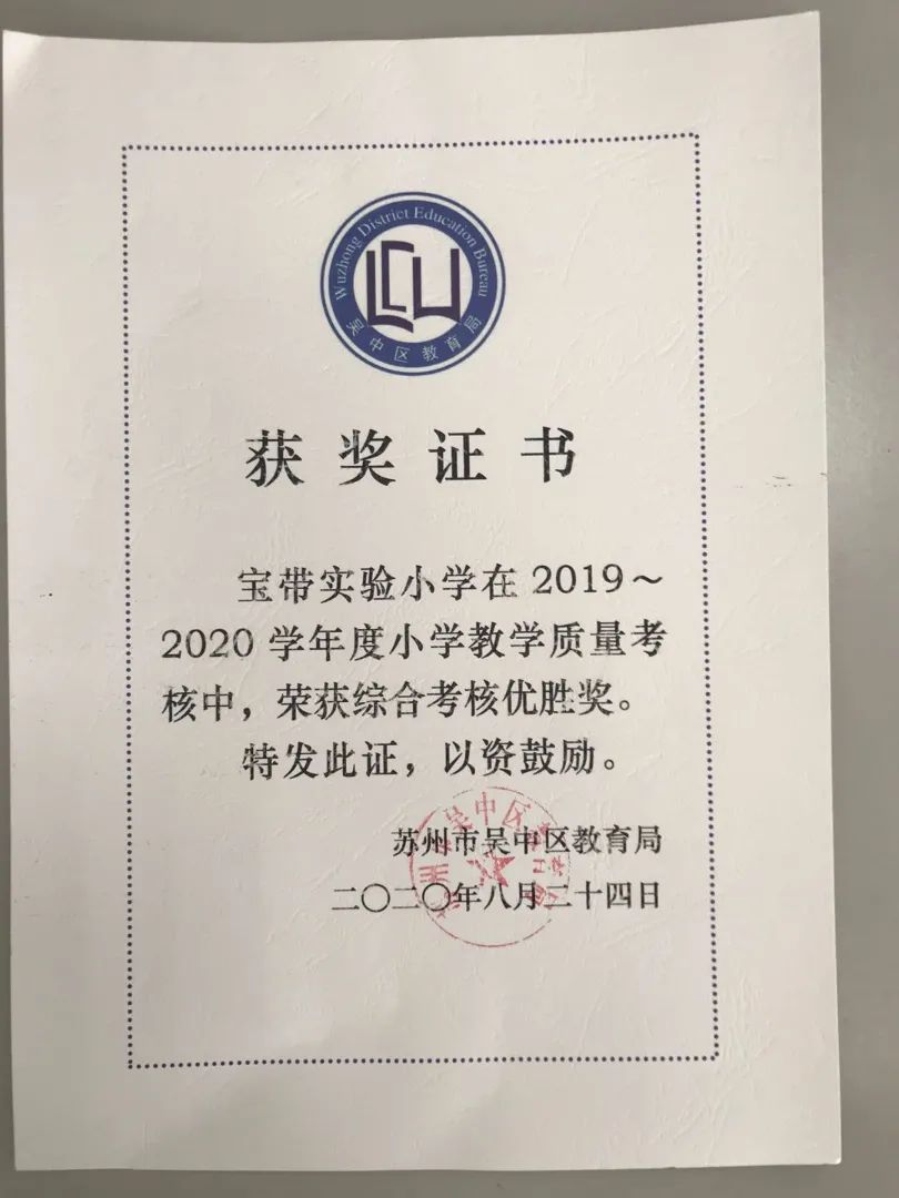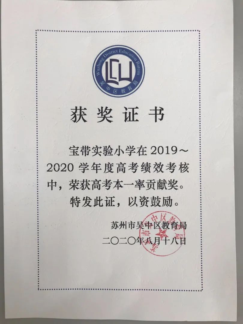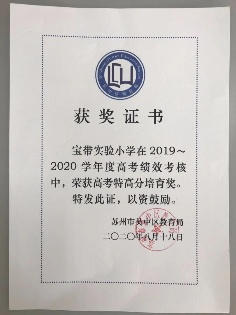 特别值得骄傲的是:宝带实验小学荣获综合考核优胜奖、高考特高分培育奖、高考本一率贡献奖、2020届中考优质生源育苗奖四项大奖!